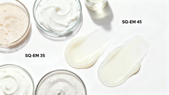 Pendant ce temps, pour les formules qui nécessitent une consistance onctueuse et laiteuse – comme les soins de la peau, les soins capillaires, les crèmes solaires ou les produits de maquillage – notreSQ-EM 35 (INCI : Polyacrylamide & Isoparaffine C13-14 & Laureth-7)etSQ-EM 45 (INCI : Polyacrylate de Sodium & Isoparaffine C13-14 & Laureth-7)exceller. Les deux se présentent sous la forme de liquides translucides blanc laiteux et conviennent parfaitement aux systèmes contenant des solvants polaires ou des polyols, offrant une excellente stabilité et une sensation luxueuse.